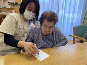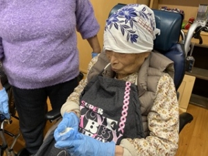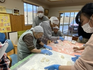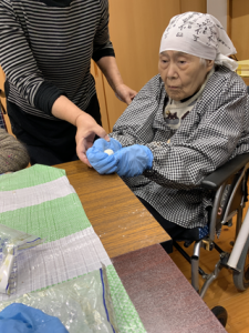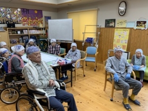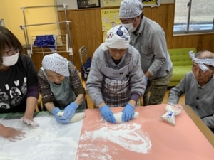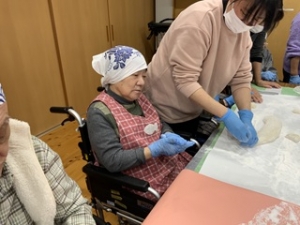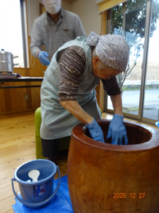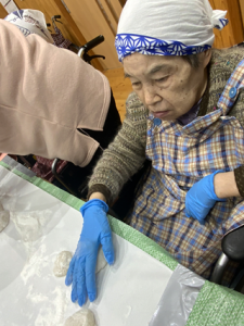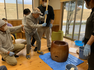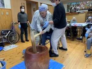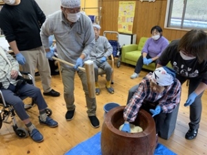 年末にはお餅つきをしました!!手拭いを巻いて、エプロンをして準備万端!! 男性陣は力強くついてくださり、女性陣は慣れた手つきで返してくださいました😲