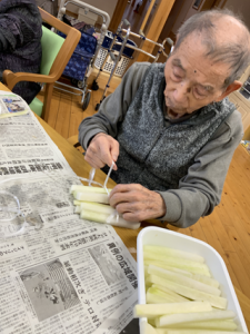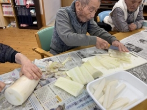 30日には職員が持って来た大根で干し大根を作りました!!「まげな大根だな~」と驚きつつ、包丁で切っておられました🔪