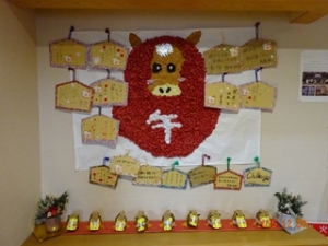 正面玄関に今年の干支「午」の壁画と皆さんの書かれた絵馬を飾りました🏇
