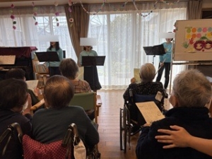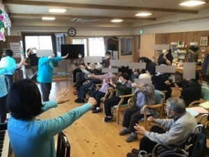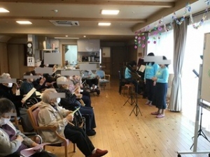 暖らんの利用者様も来られ、ボランティアのママレモンさんによる春の歌やピアノの演奏を聞いたり、体操も皆様一緒に行いました。