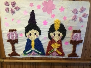 今月の壁画は「ひなまつり」。今にも桜の花びらが舞うような壁画になりました。