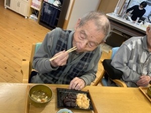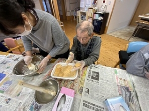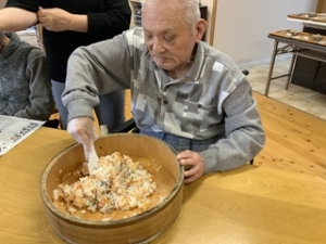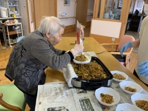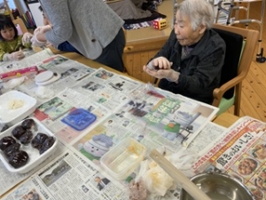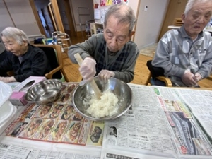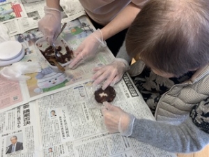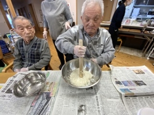 春のお彼岸では、ぼたもち作りをしました!!交代でお米を潰したり、あんこやきな粉を付けたりし、美味しそうなぼたもちが出来ました🤤